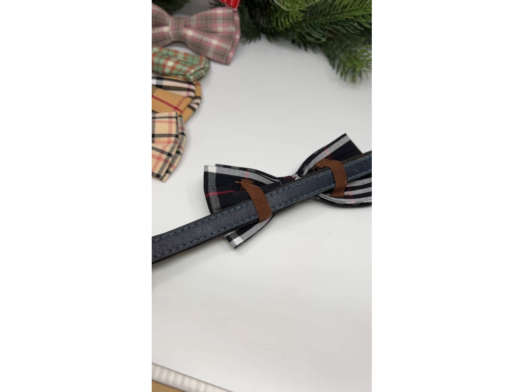 Roztomilý motýlek pro psa s károvaným vzorem, ušitý z bavlny. Využitelný pro společenské akce a oslavy. Součástí obojku, ke kterému lze připojit vodítko.