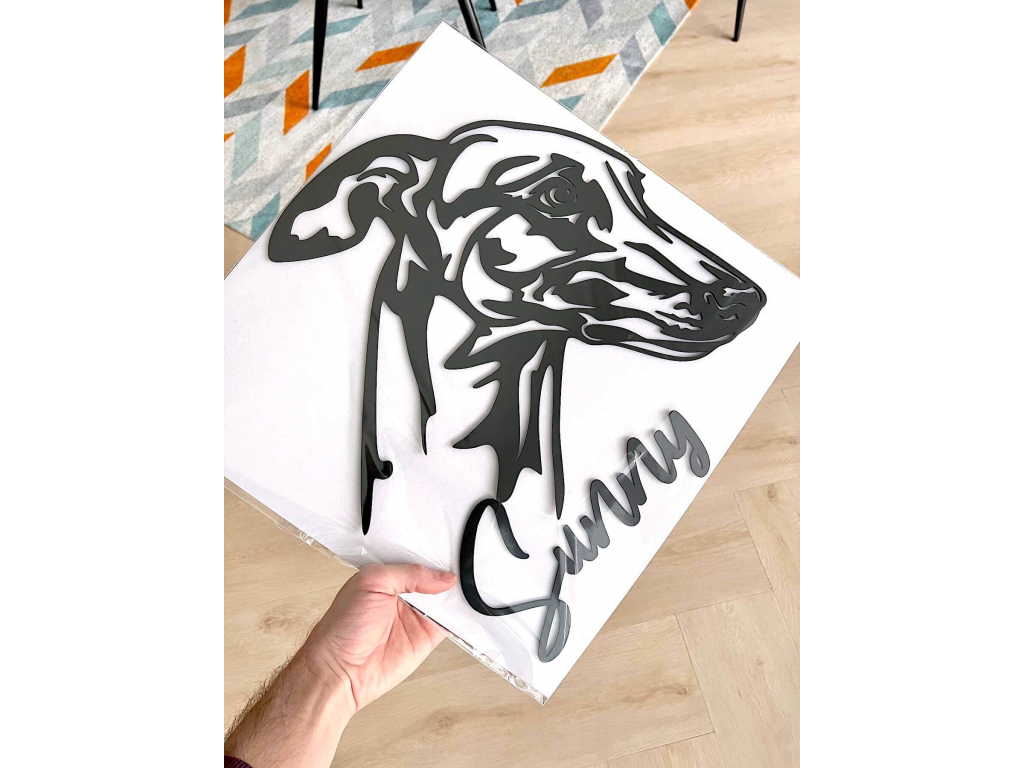 Krásná nástěnná dekorace s podobiznou anglického chrta. Zachycuje typické znaky tohoto plemene jako je štíhlá postava a dlouhá hlava se symetrickým krkem. Má bystré, šikmo uložené oči, silné čelisti a malinké uši růžicovitého tvaru. Dekoraci umístíte na stěnu pomocí oboustranné lepící pásky, která je součástí balení. Skvěle rozzáří prázdná a nudná místa ve Vašem interiéru. Dekorace do bytu je vyrobená z dřevovláknité desky, jedná se tedy o alternativu dřeva, jenž je šetrná k životnímu prostředí. Vybírat lze z více typů.