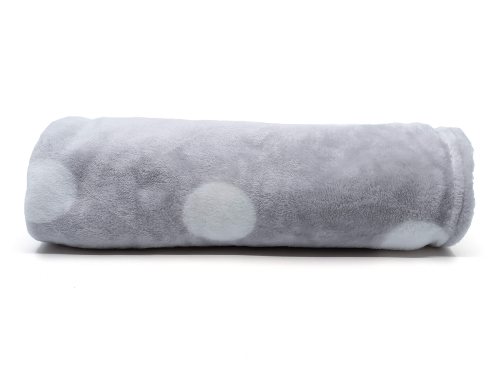 Šedá deka pro psy se velikostně hodí pro menší plemena. Je ozvláštněna kontrastně světlejšími šedými puntíky. Fleecový materiál disponuje hřejivostí a jemností. Obdélníkovou deku lze v případě ušpinění prát v pračce.