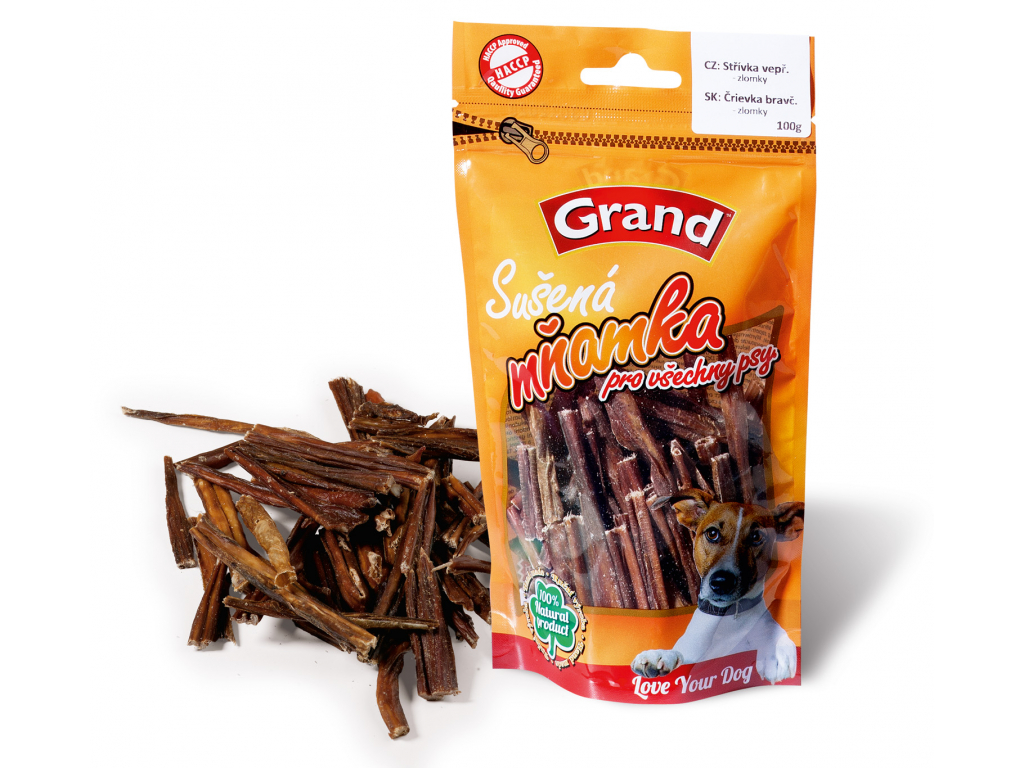 Grand vepřová střívka ve formě zlomků si díky sušení horkým vzduchem zachovávají vitamíny a minerály, a to zcela bez chemických konzervantů. Svým psím miláčkům malých i středních plemen je můžete podávat namísto pamlsků, přičemž zvlášť oceníte praktické balení na zip. Tyto chutné sušené vnitřnosti čistí chrup, posilují žvýkací svaly, vyrovnávají peristaltiku střev a příznivě ovlivňují střevní mikroflóru a hladinu žaludečních šťáv. Konzumaci lidmi ovšem nedoporučujeme.