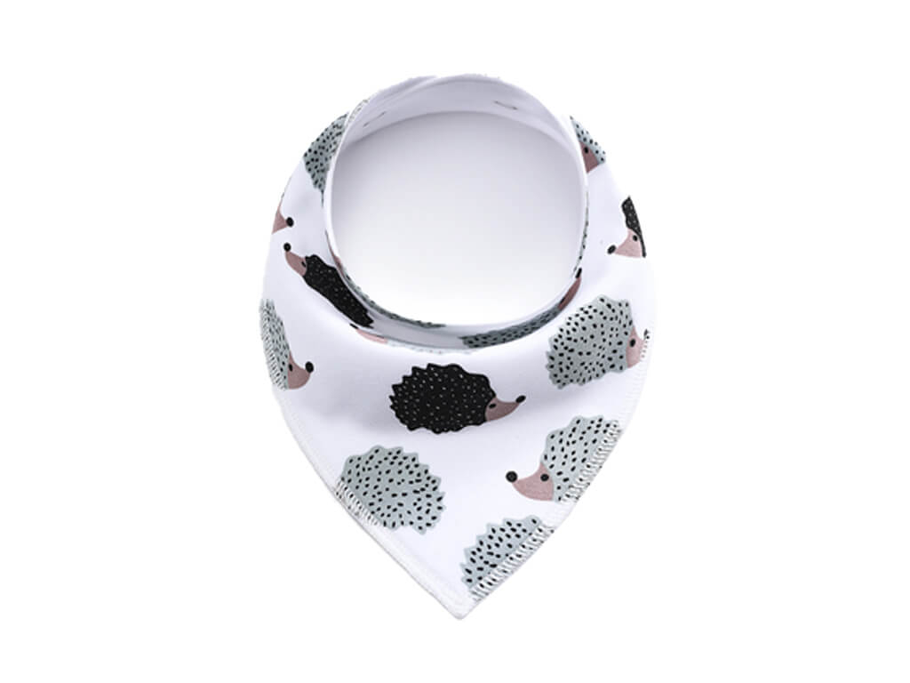 Bílý šátek pro psa s černým vzorem. Materiál polyesteru. Vhodný pro plemena s obvodem 30–40 cm kolem krku.