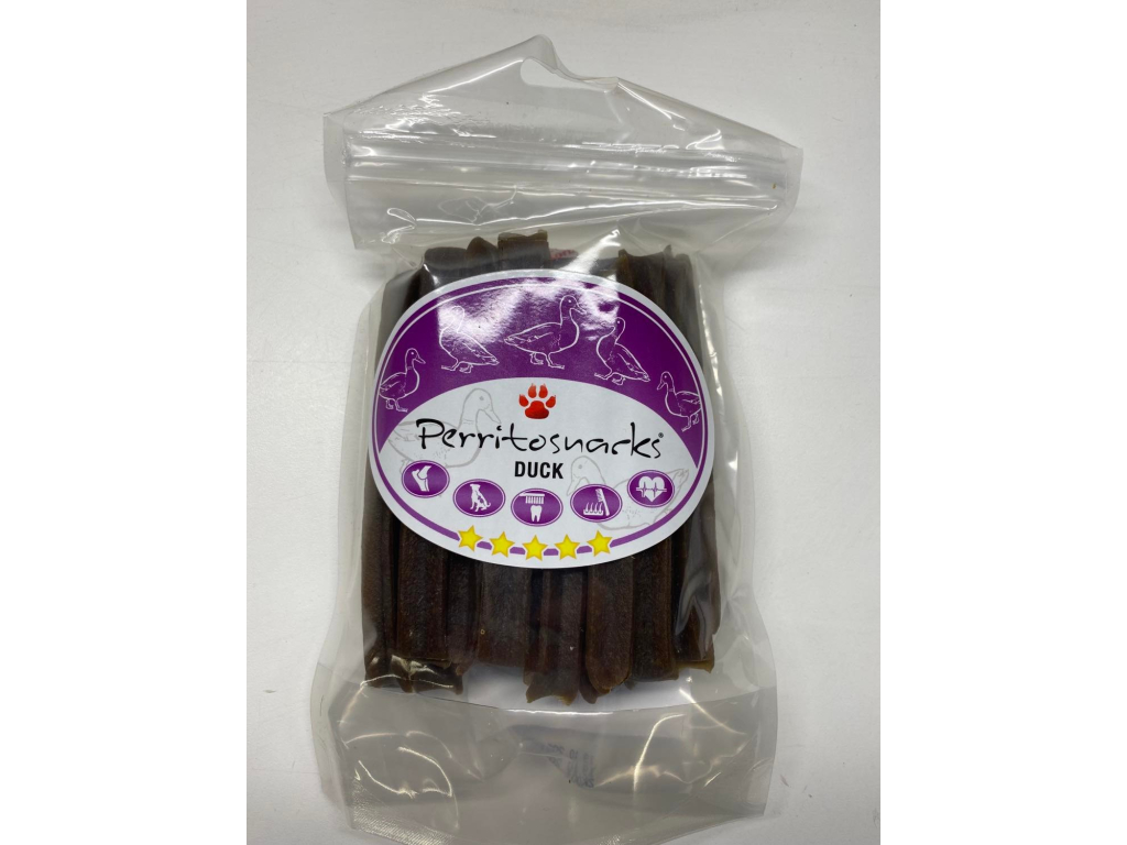 100% přírodní a kvalitní dentální pamlsky Perrito jsou vyrobené z kachního masa ve tvaru tyčinek. Určené pro malá, střední a velká psí plemena. Obsahují málo tuku a hodně bílkovin. Sušené horkým vzduchem. Uskladnit v chladu na suchém místě. Po otevření uchovávejte v lednici a spotřebujte do 7 dnů. Nekonzumujte absorbér kyslíku. Minimální trvanlivost: viz datum na obalu. Není určeno pro lidskou spotřebu. Doplňkové krmivo pro psy a kočky. Český produkt.