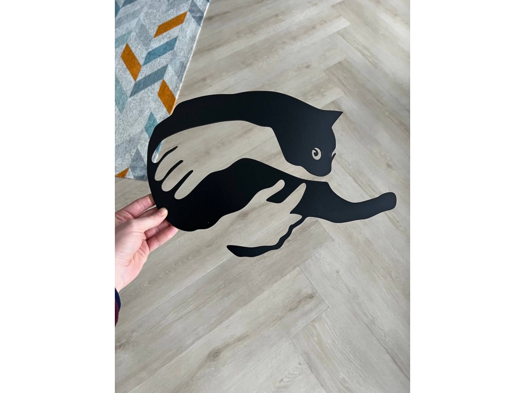 Dřevěná dekorace na stěnu znázorňující ruce, které drží kočku. Dekoraci lze snadno pověsit pomocí oboustranné lepící pásky, která je součástí balení. Skvěle se hodí jako dekorace do obýváku, chodby a na další oblíbená místa v interiéru.