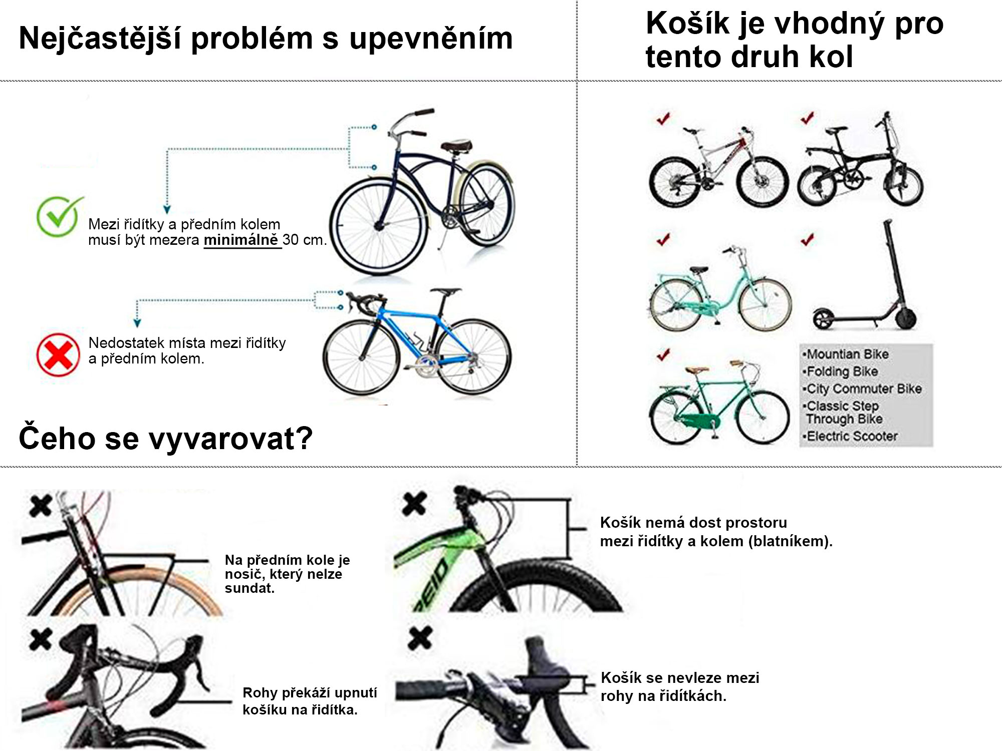Košík se připíná přímo na řidítka kola pomocí plastových přezek.