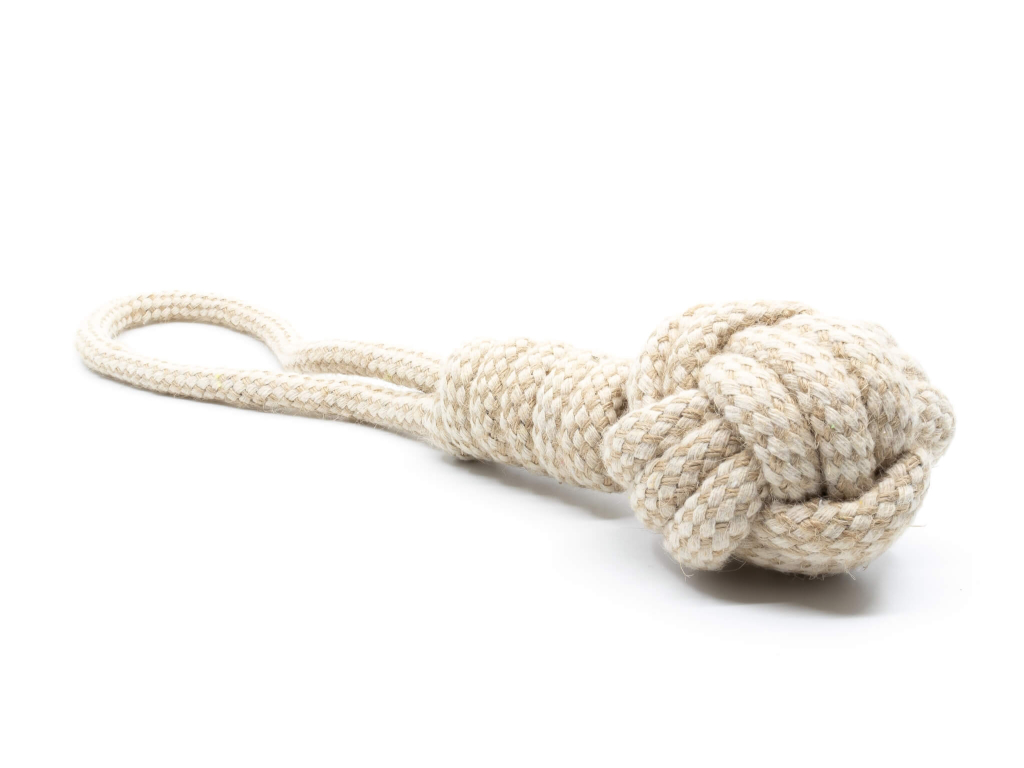 Nessie psí hračka ve tvaru smyčky s koulí vhodná pro malá a středně velká psí plemena. Dlouhá 32 cm. Ideální k přetahování a aportování. Opatřená smyčkou pro praktickou manipulaci. Bavlněné lano oplývá odolností, pevností a příjemností.