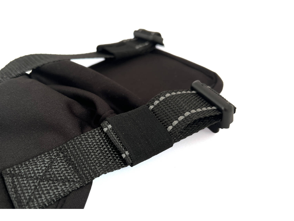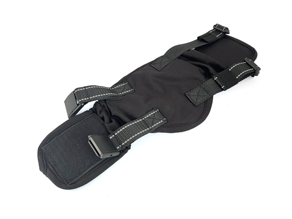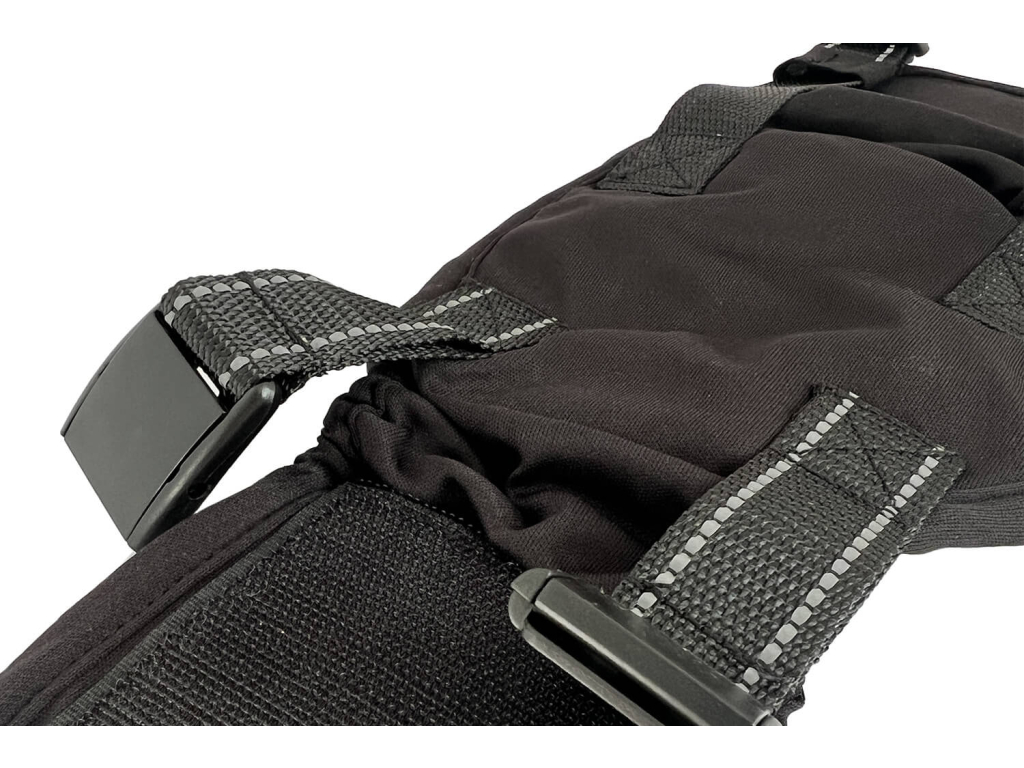 - Upevnění popruhů: Přetáhněte horní popruhy přes záda psa a zajistěte je skobou — tím pás spolehlivě zafixujete.