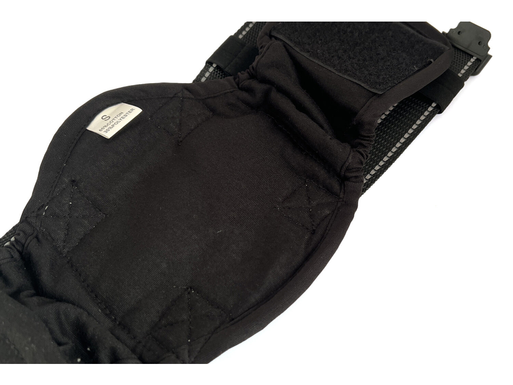 Jak pás co nejsnadněji obléct? Položte rozepnutý pás pod bříško, zapněte suchý zip tak, aby byl na hřbetě, poté přetáhněte a zajistěte bezpečnostní popruhy. Pás by měl sedět pevně, ale nesmí být příliš těsný.