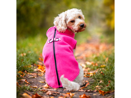 Hřejivý kabátek pro psy malého a středního vzrůstu. Polyester s heboučkým podšitým fleecem poskytuje ochranu před chladem i ušpiněním kožíšku.