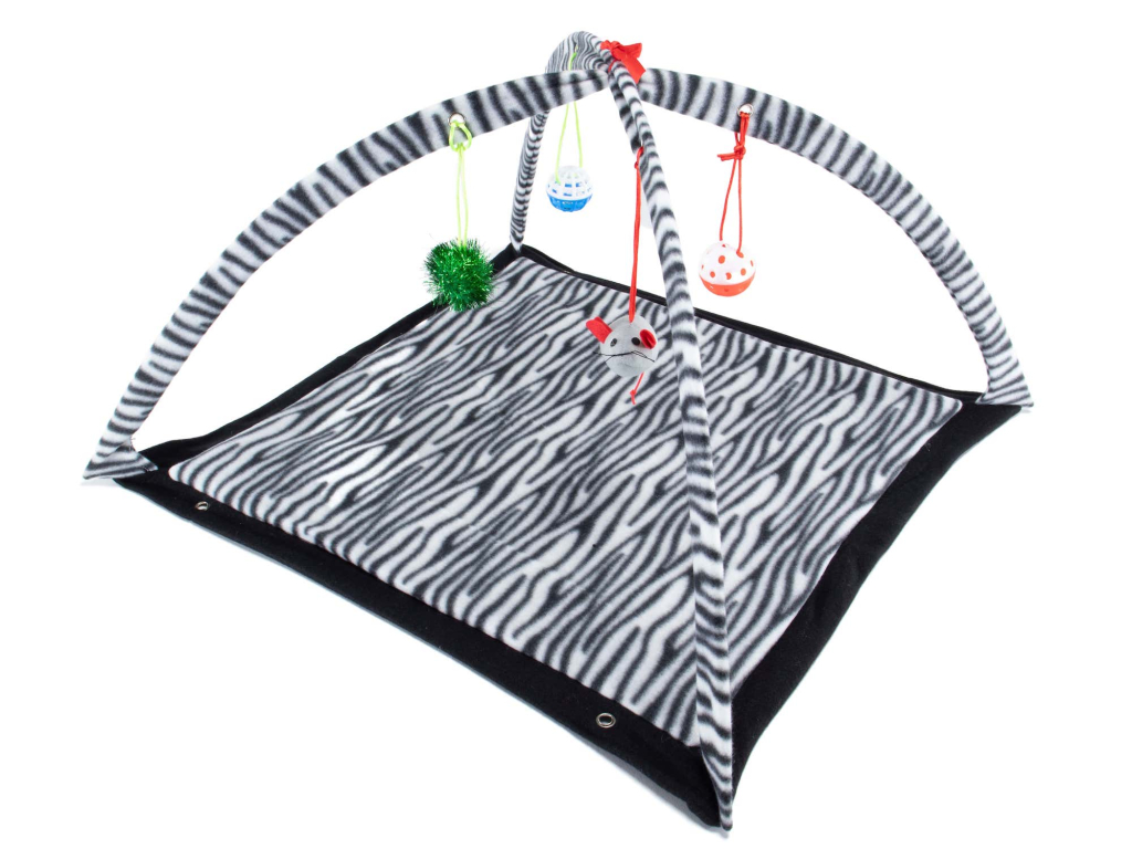 Čtyři zavěšené hračky na kovové konstrukci zajistí zábavu klidně na dlouhou dobu. Hrací deka potěší štěňátka a kočičky všech plemen. Deka ušita z příjemného polyesteru. Kovová konstrukce zajišťuje pevnost a odolnost. Zajímavé provedení a černobílý vzor potěší nejen mazlíčky, ale stane se i skvělým doplňkem Vašeho interiéru. Rozměry deky 55 x 55 cm.