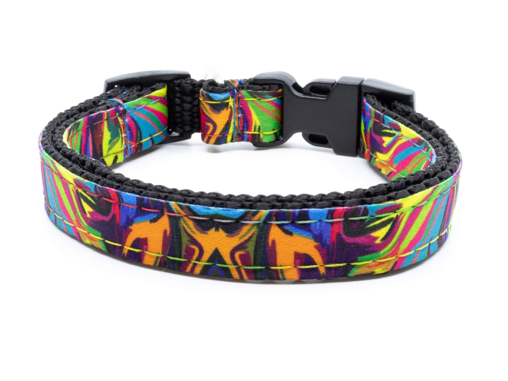 Pestrobarevný obojek, vyroben z funkčního nylonového materiálu. Disponuje šířkou 1,5 nebo 2 cm a délkou nastavitelnou pomocí plastové karabiny podle šířky krku pejska. Ideálně velikostně vyhovuje malým a středně velkým plemenům psů nebo štěňátkům.