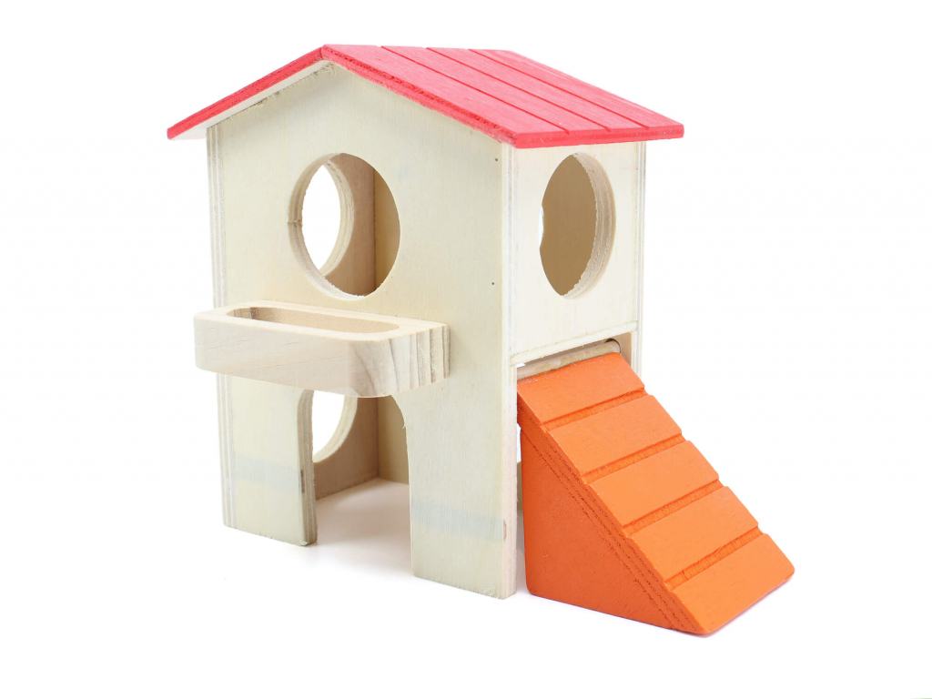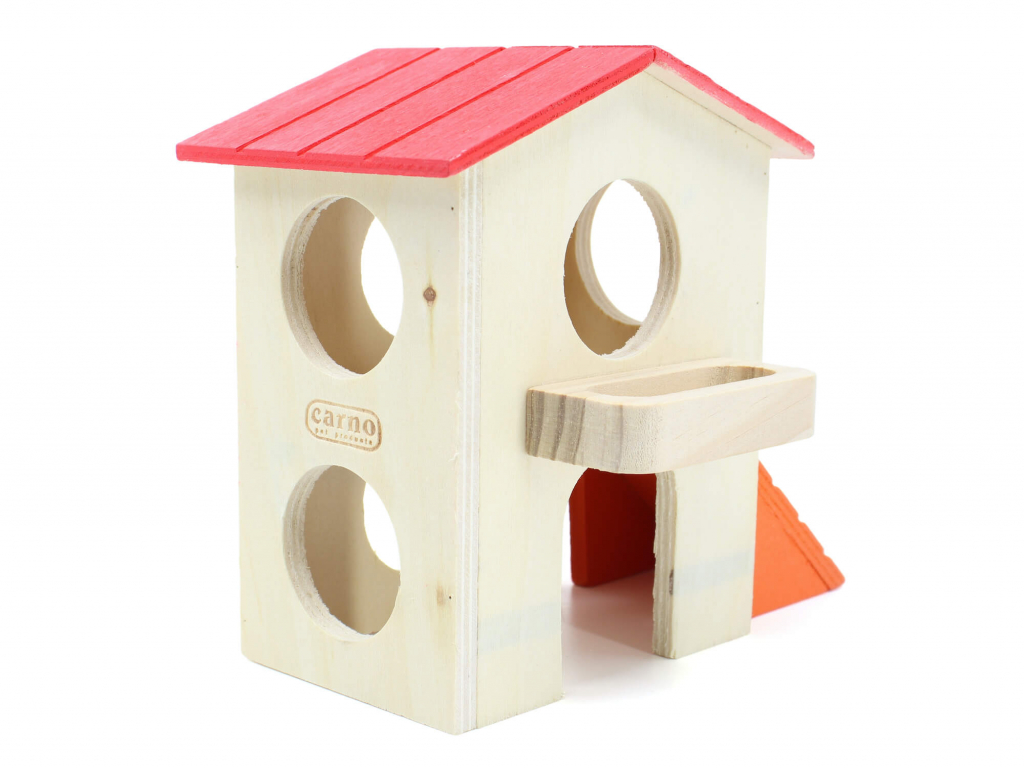 Multifunkční dvoupatrový domeček pro hlodavce menšího vzrůstu. Nabízí malým mazlíčkům kryté místo k odpočinku, nabrání sil i vydovádění. Na domečku se nachází více vstupních otvorů a lezecké schůdky, ty lze využít k oblíbeným aktivitám - lezení a prolézání. Dřevěný materiál oplývá kvalitní strukturou, která přiblíží mazlíčkům jejich přirozené prostředí. V případě broušení drápků a zoubků je dřevo zcela nezávadné. Dřevěnou misku připomínající balkon můžete využít na suché krmivo.